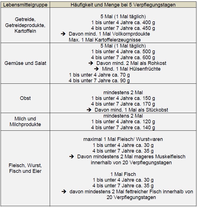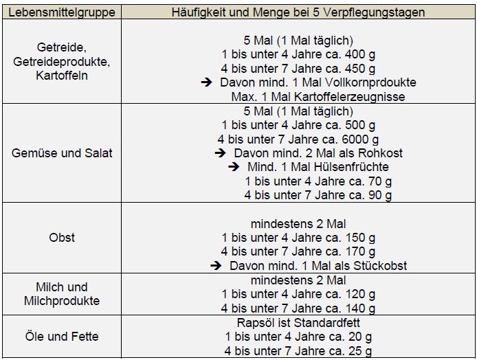 Je nach Alter der Kinder liegt eine Varianz bezüglich des Energie- und Nährstoffbedarfes vor. Auch eine Varianz der Portionsgröße liegt demnach je nach Kindesalter vor. Die folgende Tabelle stellt eine Übersicht der Mengen und Häufigkeiten an Lebensmitteln dar, die es bei 5 Verpflegungstagen umzusetzen gilt. Die Daten entsprechen den Qualitätsstandards für die Verpflegung in Kitas der Deutschen Gesellschaft für Ernährung (DGE):