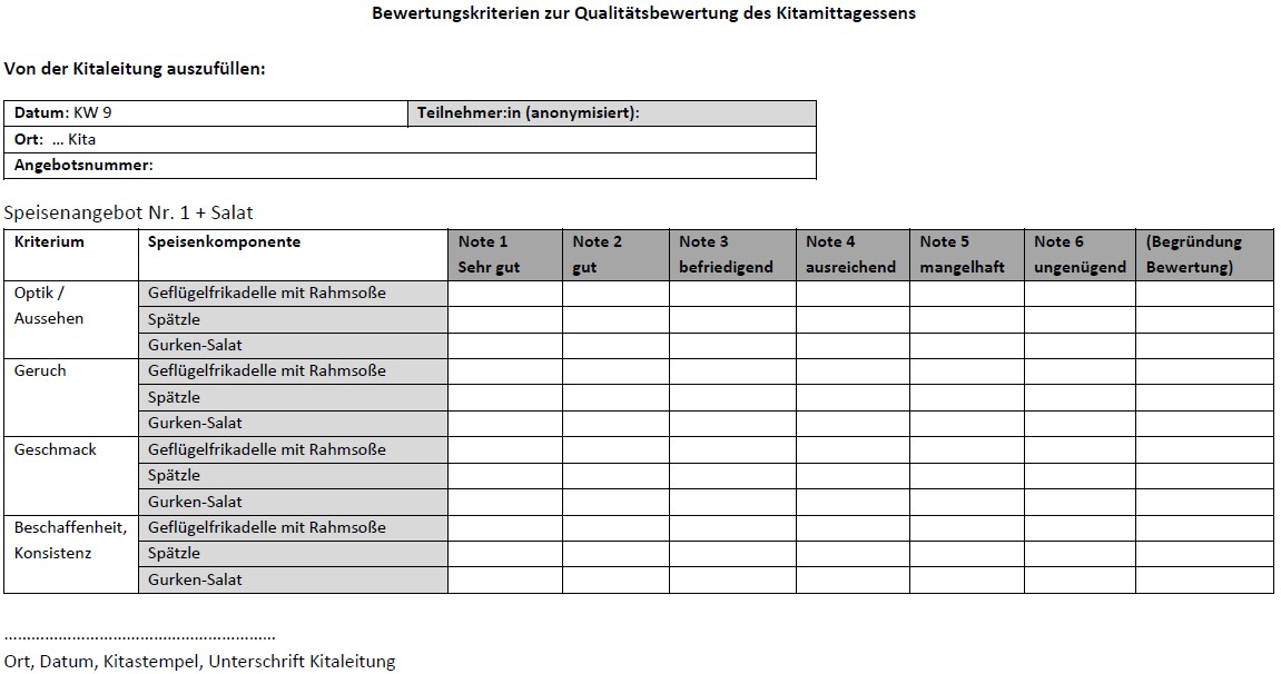 Bewertungskriterien zur Qualitätsbewertung des Kitamittagessens
