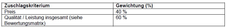 Hieraus resultiert eine Gesamtpunktzahl von 0 – 100 Punkten für ein Angebot bezüglich der Qualitätskriterien.