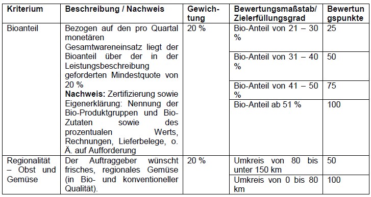 Es werden als Zuschlagskriterium zusätzliche Bewertungspunkte für einen höheren Bio-Anteil vergeben (siehe Kapitel 13.3).