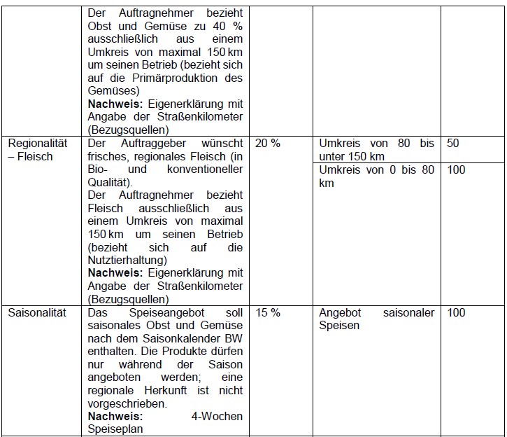Das vom Auftragnehmer verwendete Gemüse und Obst hat zu 40 % und Fleisch zu 100 % das Kriterium „regional“ zu erfüllen. Regional bedeutet hierbei, dass die Ware aus einem Umkreis von maximal 150 km des verarbeiteten Betriebs, der Produktionsstätte, des Auftragnehmers stammt. Der Anbau von Obst/Gemüse sowie die Haltung der Tiere muss nachweislich von Betrieben innerhalb des genannten Radius erfolgen.