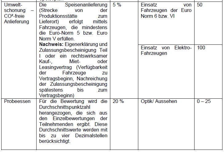 Angebote mit einer Speisenanlieferung mit Fahrzeugen der höherwertigen Euro-Norm oder mittels einer kohlenstoffdioxidfreien Speisenanlieferung erhalten zusätzliche Punkte. Der Einsatz von Fahrzeugen der Euro-Norm 6 bzw. Euro-Norm VI oder von Elektro-Fahrzeugen ist durch die Abgabe einer Eigenerklärung im Zuge der Angebotsabgabe zu versichern. Es handelt sich bei der Speisenanlieferung um die Strecke von der durch den Caterer übermittelten Produktionsstätte bis zur Vertragseinrichtung.