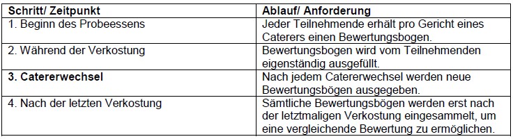 Alle Bietenden haben dieselben Gerichte bzw. Gerichtskomponenten bereitzustellen. Die Verkostung erfolgt als Blindtest, d. h. den Testpersonen ist nicht bekannt, von welchem Bietenden die einzelnen Speisen stammen. Zur Wahrung der Anonymität der Bietenden erfolgt zudem eine räumliche Trennung. Das eingesetzte Personal hat neutrale, nicht firmengekennzeichnete Kleidung zu tragen. Jeglicher Kontakt zwischen Bietenden und Teilnehmenden ist untersagt. Verstöße diesbezüglich führen zum Ausschluss. Änderungen oder fehlende Speisekomponenten sind zudem nicht zulässig und zusätzliche Komponenten dürfen nicht ausgegeben werden. Nur vorhandenes Küchen-Geschirr und Besteck ist zu verwenden.
