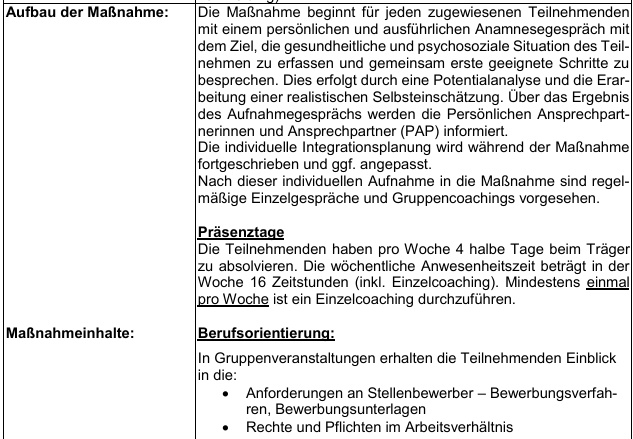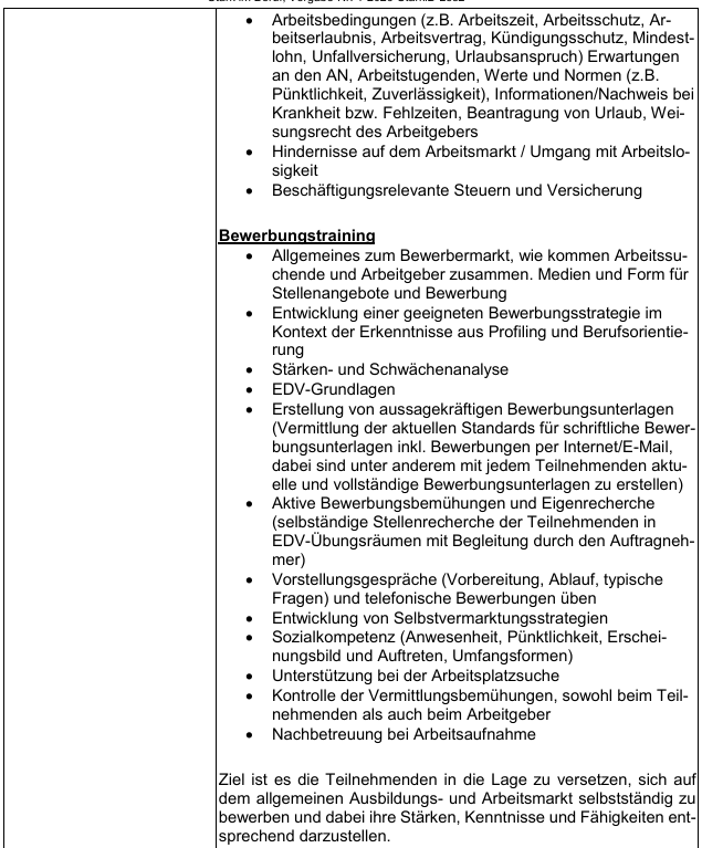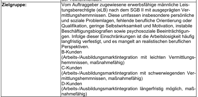 Die Maßnahme „Stark im Beruf“ ist eine Maßnahmekombination aus § 16 Abs. 1 Zweites Buch Sozialgesetzbuch (SGB II) in Verbindung mit § 45 Abs. 1 Nr. 1, 3 und Nr. 5 Drittes Buch Sozialgesetzbuch (SGB III) als Präsenzmaßnahme. Die Maßnahme hat das vorrangige Ziel, arbeitslose erwerbsfähige Leistungsberechtigte (eLB) in den ersten Arbeitsmarkt zu integrieren. Bei arbeitsmarktfernen Teilnehmenden hat die Maßnahme das Ziel, eine Annäherung an den Arbeitsmarkt zu erreichen und individuelle Vermittlungshemmnisse abzubauen. Dies soll vor allem durch eine intensive Betreuung und Aktivierung erreicht werden. Zur Zielerreichung sollen alle regional maßgeblichen Akteure miteinbezogen werden, die ei nen Erfolg der Gesamtstrategie unterstützen. Arbeitslose weisen eine höhere Kranken- und Sterblichkeitsrate auf, sind wesentlich höheren gesundheitlichen Belastungen ausgesetzt und verfügen über deutlich geringere gesundheitliche Ressourcen als Erwerbstätige: Arbeitslose sind rund doppelt so häufig krank wie Erwerbs tätige (DGB 2010). Laut BKK Gesundheitsreport 2018 weisen Arbeitslose die meisten Arbeitsunfähigkeitstage aller Gruppen auf. Zudem sind sie im Durchschnitt in etwa dreimal so lange krank wie Erwerbstätige. Krankenkassendaten zur Arbeitsunfähigkeit zeigen, dass mehr als ein Drittel der Versicherten im SGB II-Leistungsbezug innerhalb eines Jahres mindestens eine psychiatrische Diagnose aufwies (IAB 2013). Deshalb soll künftig der Fokus auch auf die Förderung der Gesundheit gelegt werden. Um eine zeitnahe Aktivierung und Unterstützung der Teilnehmenden zu ermöglichen, sind ein flexibler Einstieg und eine auf die individuellen Belange der Teilnehmenden abgestimmte Förderung sicher zu stellen. Die Maßnahme beinhaltet folgende Elemente: · Heranführung der Teilnehmenden an den Ausbildungs- und Arbeitsmarkt sowie Feststellung, Verringerung oder Beseitigung von Vermittlungshemmnissen (§ 45 Abs. 1 S. 1 Nr. 1 SGB III) · Vermittlung in eine versicherungspflichtige Beschäftigung (§ 45 Abs. 1 S. 1 Nr. 3 SGB III) · Stabilisierung einer Beschäftigungsaufnahme (§ 45 Abs. 1 S. 1 Nr. 5 SGB III). Diese Maßnahme kann alle Aktivitäten umfassen, die auf die dauerhafte berufliche Eingliederung in eine versicherungspflichtige Beschäftigung im Sinne des § 25 Abs. 1 S. 1 SGB III gerichtet sind. Bei der Durchführung der Maßnahme hat der Auftragnehmer insbesondere den Grundsatz des § 36 SGB III zu beachten. Die Gesamtkonzeption (Inhalt, Durchführung und Methodik) liegt in der Gestaltungsfreiheit des Bieters und muss auf die individuellen Bedürfnisse der zugewiesenen Teilnehmenden zugeschnitten sein. Eine Konzeptberatung an Bieter im Vorfeld der Angebotsabgabe durch den Auftraggeber er folgt nicht. Der Auftraggeber erwartet, dass innerhalb der Maßnahme mindestens 20 % der Teilnehmen den in versicherungspflichtige Teil- oder Vollzeittätigkeiten vermittelt werden (Integrationsquote). Die Teilnehmenden sollen durch individuelle Beratung Schwächen im bisherigen Bewerberverhalten erkennen und beseitigen, sowie sich optimal auf vorhandene Stellen bewer ben können. Zusätzlich sollen die Motivation, die Vermittlungsfähigkeit und die Eigenbemühungen der Teilnehmenden gefördert werden. Zielgruppe Die Maßnahme richtet sich an vom Auftraggeber zugewiesene erwerbsfähige männliche Leistungsberechtigte (eLB) nach dem SGB II mit ausgeprägten Vermittlungshemmnissen. Diese umfassen insbesondere persönliche und soziale Problemlagen, fehlende berufliche Orientierung oder Qualifikation, geringe Selbstwirksamkeit und Motivation, instabile Beschäftigungsbiografien sowie psychosoziale Beeinträchtigungen. Infolge dieser Einschränkungen ist die Arbeitslosigkeit häufig langfristig verfestigt, und es mangelt an realistischen beruflichen Perspektiven.